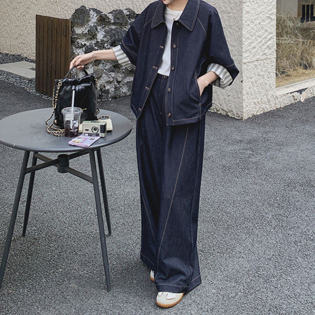 スタイリッシュなストライプデザインが特徴のデニムセットアップです。カジュアルシーンからビジネスカジュアルまで幅広く活躍し、洗練された印象を与える一着となっています。ジャケットとパンツのセットで、コーディネートも簡単!快適な着心地で、デイリーユースにもおすすめです。